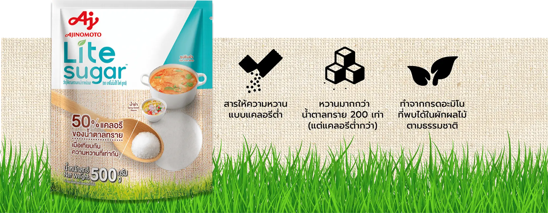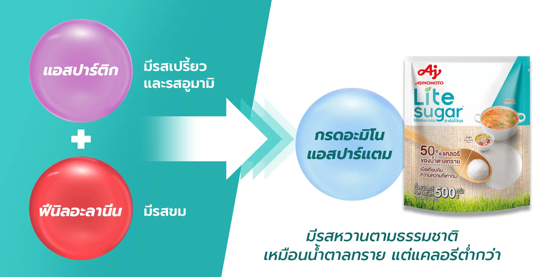 แต่ด้วยองค์ความรู้ด้าน ‘AminoScience’ หรือ ศาสตร์แห่งกรดอะมิโนของอายิโนะโมะโต๊ะ ทำให้สามารถผลิตสารให้ความหวานจากกรดอะมิโนอย่าง ‘แอสปาร์แตม’ (aspartame) และพัฒนาไปสู่ผลิตภัณฑ์ อายิโนะโมะโต๊ะ ไลท์ ชูการ์ (Ajinomoto Lite Sugar) ได้สำเร็จ เพื่อใช้เป็นวัตถุให้ความหวานแทนน้ำตาลชนิดผงที่ช่วยลดความเสี่ยงของการเกิดโรคจากการบริโภคน้ำตาลปริมาณมากเกินพอดี