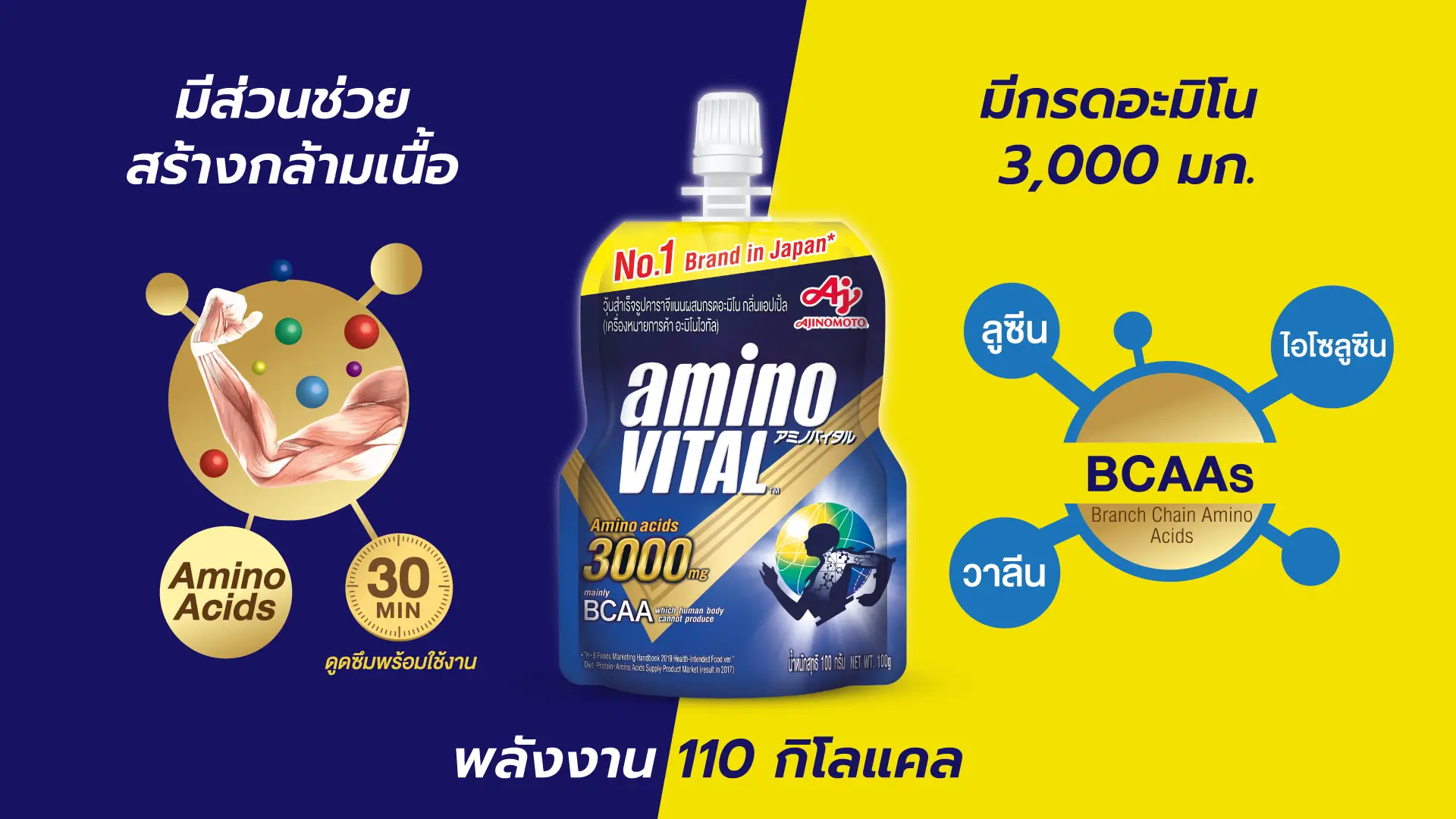 ศาสตร์แห่งกรดอะมิโน (AminoScience) ซึ่งมุ่งเน้นไปที่การพัฒนา 4 หน้าที่หลักของกรดอะมิโน ได้แก่ การปรุงรสชาติอาหารให้อร่อย การนำสารอาหารไปสู่ร่างกาย การส่งเสริมสุขภาพที่ดี และการตอบสนองที่นำไปสู่การสร้างฟังก์ชันใหม่ จึงเข้ามาตอบโจทย์การเติมกรดอะมิโนเพื่อนำไปสร้างโปรตีนที่ร่างกายของเราสูญเสียกล้ามเนื้อจากการออกกำลังกาย ด้วยการคิดค้นผลิตภัณฑ์ aminoVITAL กรดอะมิโนในรูปแบบเพาเวอร์เจลที่มีส่วนผสมของ BCAAs มากกว่า 50% ของกรดอะมิโนทั้งหมด ตัวช่วยในการเติมพลังงานและมีส่วนช่วยในการซ่อมแซมกล้ามเนื้อที่สูญเสียไป