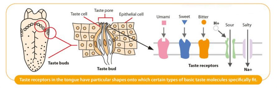 ในขณะที่เรากำลังรับประทานอาหาร หากส่องกล้องขยายดู เราจะเห็น ตัวรับรสบนลิ้น (Taste receptor) ซึ่งมีรูปร่างจำเพาะเข้ากับโมเลกุลที่ให้รสชาติพื้นฐานต่าง ๆ เหมือนแม่กุญแจกับลูกกุญแจ เช่น กลูตาเมต คู่กับ รสอูมามิ ซูโครส คู่กับ รสหวาน โซเดียมคลอไรด์ คู่กับ รสเค็ม และกาเฟอีน คู่กับ รสขม เมื่อตัวรับรสได้รับสารที่ทำให้เกิดรสชาติจะส่งสัญญาณไปยังสมองผ่านเส้นประสาทรับรส (Facial nerve and glossopharyngeal nerve)